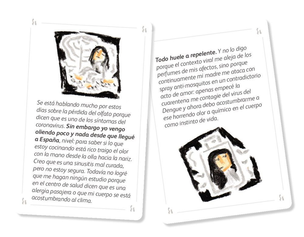 No fue cosa fácil, para las participantes de este Anti Veo Veo, llegar al momento de jugar con el olfato. No porque no nos gusten los aromas: todo lo contrario. Amamos el olor a comida que entra por la ventana al mediodía, el del pan casero; el olor a piel sin aditivos, a los árboles floreciendo en Barcelona, o el que sale de las hojas secas cuando crujen en Rosario. Pero la información que hoy estamos pudiendo percibir desde las fosas nasales nos obliga a cruzar los dedos por un momento, pausar el juego y hacer gancho.