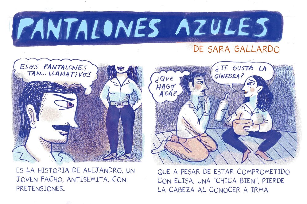 #1libroen4cuadros. Cuatro viñetas por día, una reseña de lecturas recomendadas que cranearon julia barata y mariana ruiz johnson. Hoy Pantalones azules, de sara gallardo. texto e ilustración: @marianaruizjohnson